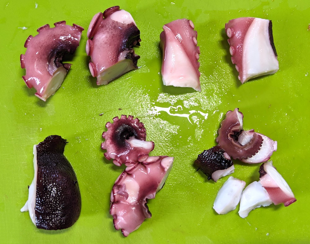 うちの家では1回に69個焼きます。たこだけは焼く個数にあわせていたいので、7等分ぐらいに切り分けてから、それぞれを10個ぐらいに切り分けます。