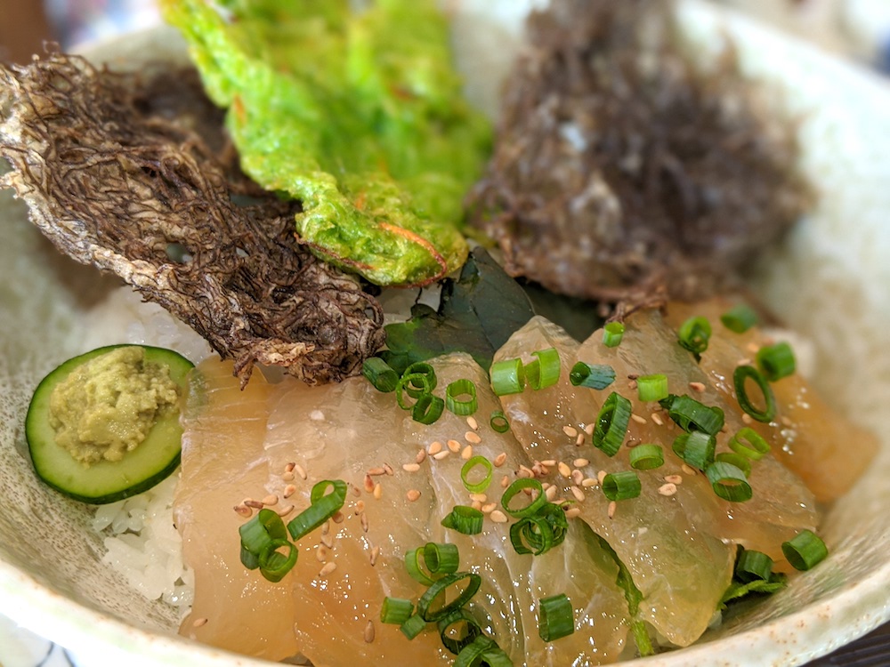 個人的にナンバーワン島飯だった魚匠の「ウンギャル丼」。ウンギャルの出汁をかけてサラサラ食べる。パパイヤの漬物、島の味噌、もずく。おばちゃんおねえさんからおまけで島のお餅をもらった。