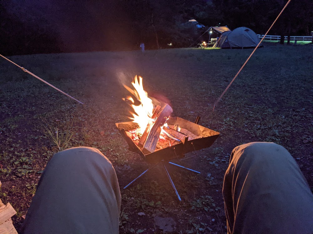 最後はコーヒーを飲みながら焚き火で締めます。22時消灯なので、逆残してうまいこと薪と炭を燃やしきらないとだめなことを学びました。