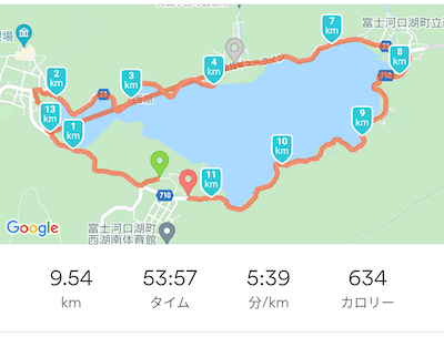 外周がちょうど10キロぐらいなので、ちょうどいいコースです。風景はきれい。ただ、風景が単調なので、普段走るよりなんだか疲れた気がします。湖の外周は起伏もなくていいですね。