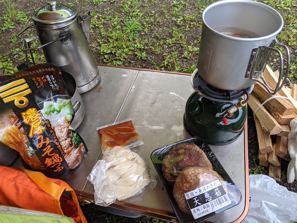 現地で薪を初めて買いましたが、松600円、広葉樹1000円とお高い感じです。一人だと薪2束と炭で足りました。