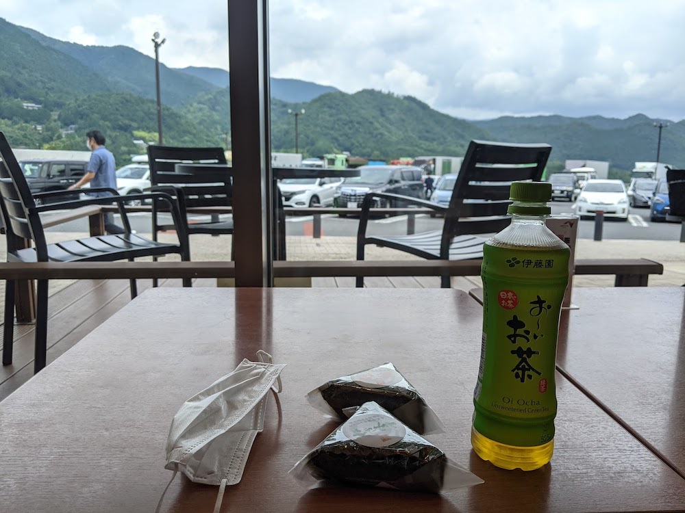 朝出発したので昼食はここでおにぎりを少々。眺めが良いですね。このSAにはスタバもあります。