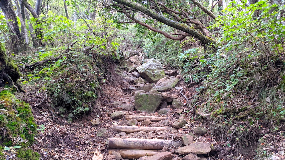 駐車場向かいの登山口から登りはじめます。登山道に入るのは、たぶん屋久島以来。
