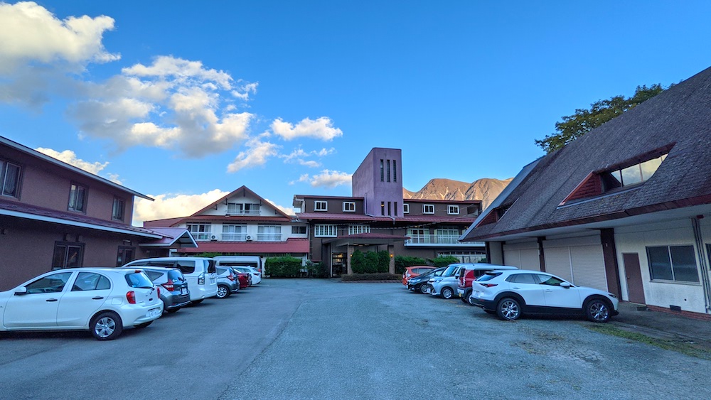 ホテルは九重観光ホテルを利用しました。登山口の牧ノ戸峠まで5分の好立地です。硫黄の匂いがプンプンして、温泉は最高。食事もヤマメの丸揚げなど美味しかった。