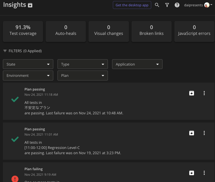 単純にテストの成功率を知りたいのであれば、mablのカバレッジページから確認もできます。