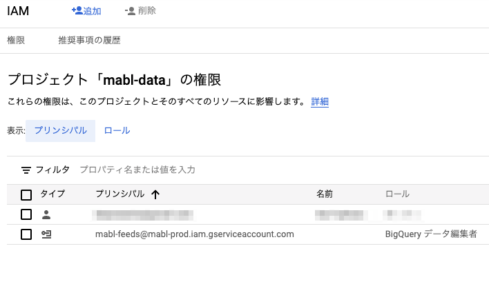 次に、mablがBigQueryにアクセスできるように、専用のサービスアカウントを編集者権限で追加します。詳細は公式ヘルプのBigQuery統合(日本語訳しておきました)もご確認ください。
