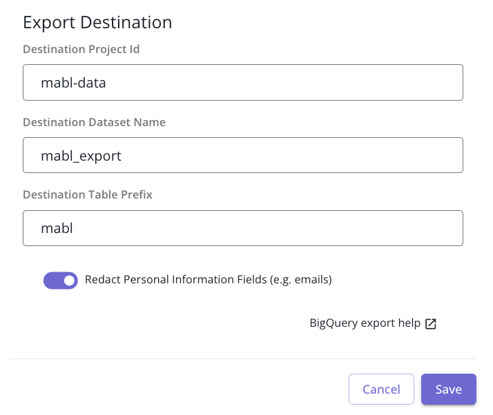 「Redact Personal Information Fields (e.g. emails)」というのは、個人情報部分をどうするかの設定です。詳細は公式ヘルプのBigQuery統合を確認ください。