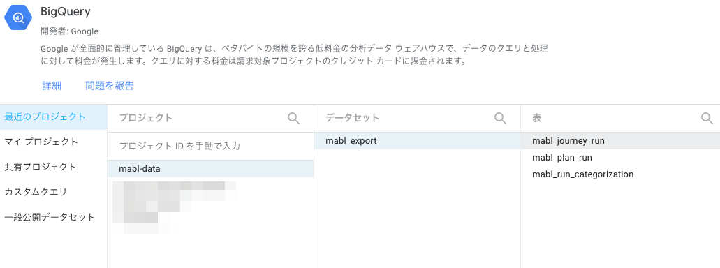 まず、BigQuery用のプロジェクトを作成します。ここでは「mabl-data」というプロジェクトIDにしました(プロジェクト名ではない)。