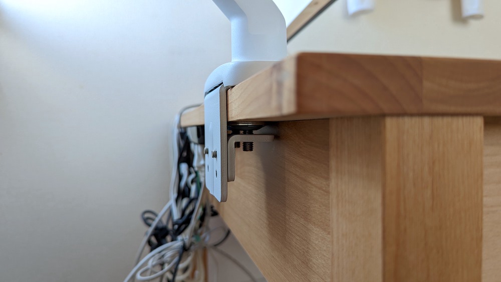 寝室の机には引き出しがあり、モニタアームの設置がしにくい構造になっています。過去にHUANUOのアームを試しましたが、アームと机の接地面が小さく、モニタの重みでぐらついていました。