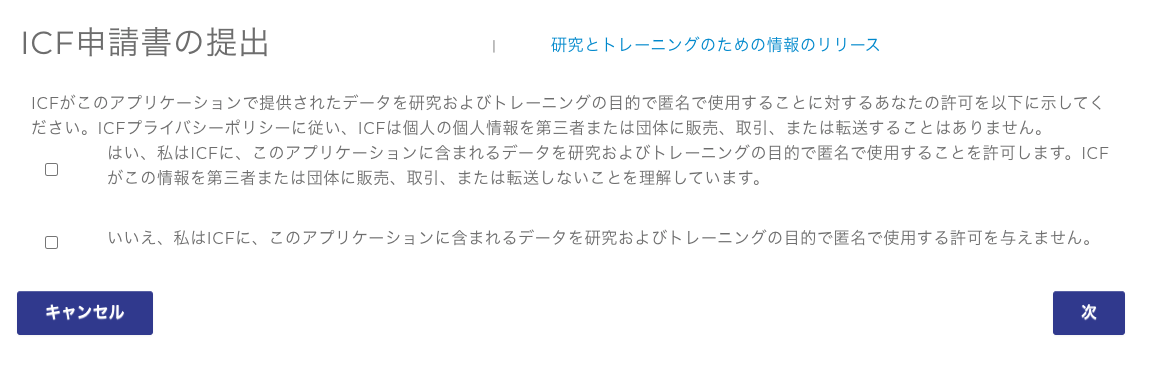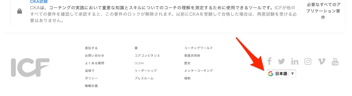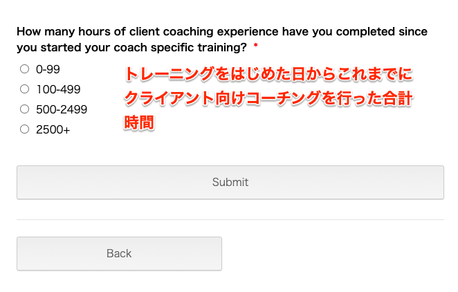 ICF認定資格のページから「オンライン出願を申し込む」をクリック。英語のサイトに飛ばされ、申請を継続します。以下のアンケート部分以外は、Google翻訳が使えるので英語が苦手でも特に迷わないと思います。
