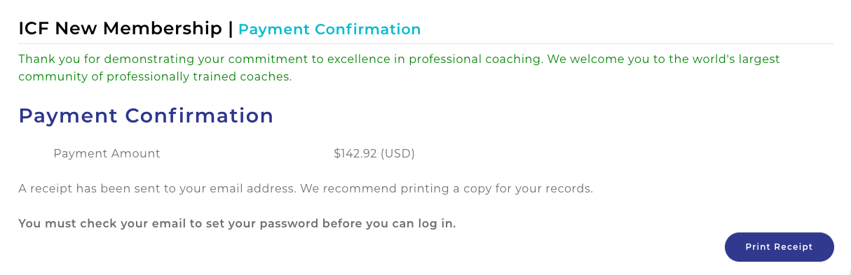 ICF有料会員は1年$245なので、会員になれば得するというわけでもないです。ただ、会員は毎年4月から3月までの1年が有効期限になるため、9月に会員登録したときは月割計算なのか、請求額が$142.92でした。よって、秋口以降にICF有料会員登録すると、ちょっとお得なのかも。ICF有料会員登録については後述します。