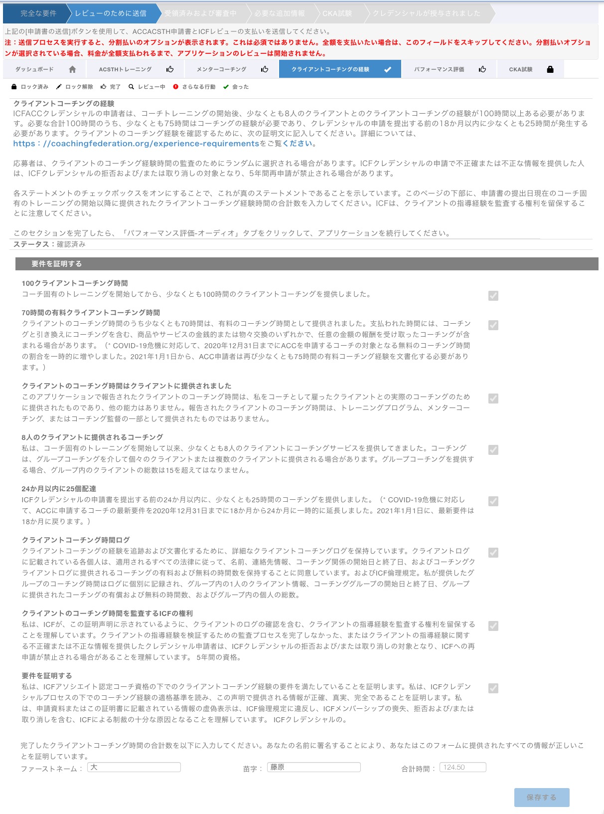実技審査(パフォーマンス評価)は、普段1on1セッションを行っている方にお願いして、音声を録音して書き起こし、DeepLなどを使って英語化しました。お金を出してやってもらうこともできましたが、自分の音声を聞きながら文字に書き起こしていくと、自分の癖や得意不得意がよくわかって勉強になりました。たまに録音して聞き直すのはいいプラクティスかもしれません。