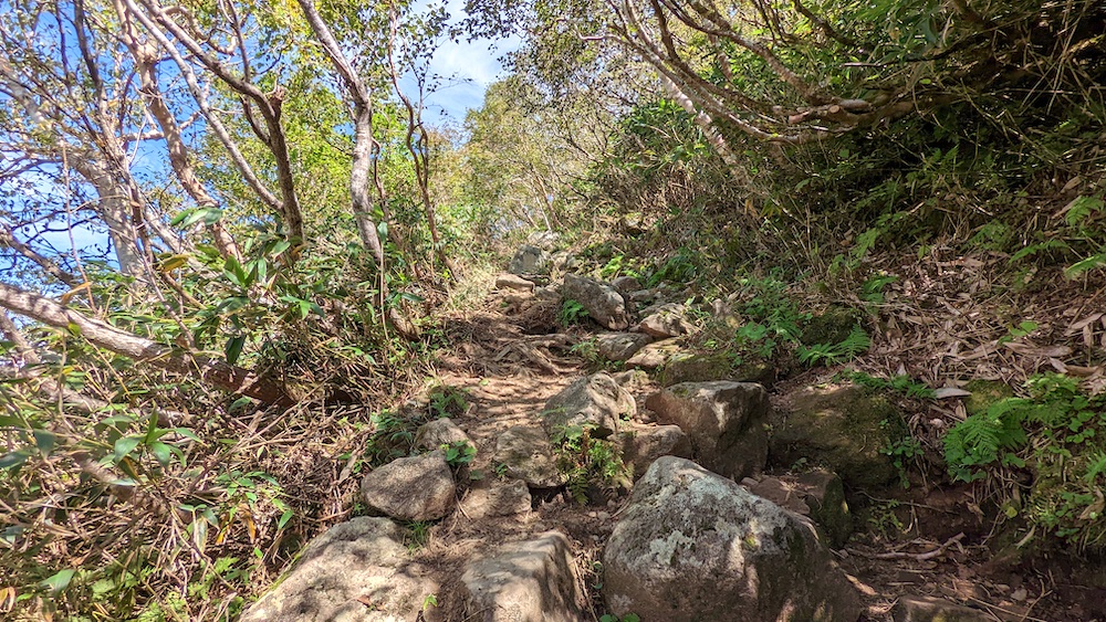 ようやく頂上が見えていきますが、岩場の尾根をずっと歩いていきます。はじめから最後までずっとなかなかの登りが続き、標高も1,625mあるので息が上がります。
