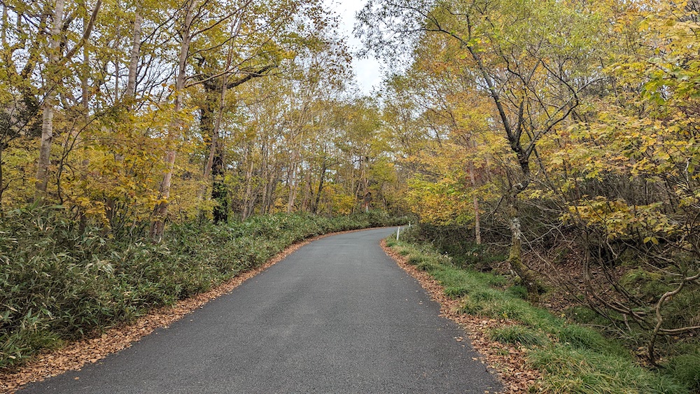 本当は河原の坊からの登山道があるのですが、荒れてしまって使えないので隣の登山道まで25分ほどゆるやかな坂道を歩かなければなりません。なかなか面倒ですが、準備運動になりますし、紅葉で美しい風景を楽しめます。