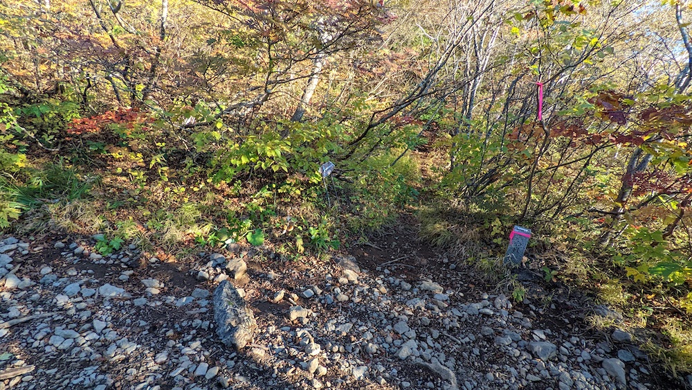 トイレと小休止をすませたら頂上を目指します。避難小屋前に荷物をおいてアタックするのもよいですが、避難小屋の少し先、頂上前の急登のふもとにも避難小屋があるので、デポするならそちらのほうがいいとおもいます。