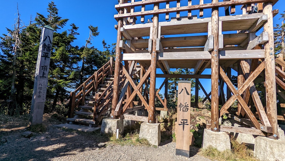 舗装されてるのになぜか凸凹感のある謎の登山道を登るとすぐに八幡平頂上です。そこには見晴台がありますが、とくに見晴らしがいいわけではなく、個人的にこれまで登ってきた100名山で一番がっかりする頂上でした。