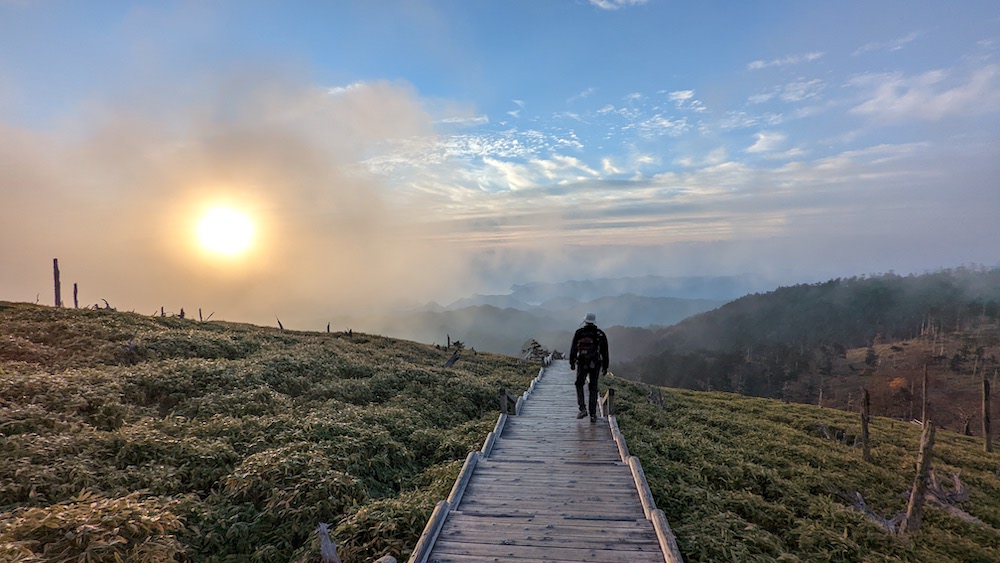 森林がない地域は木道が続きます。歩きやすいけど風の影響で寒いです。