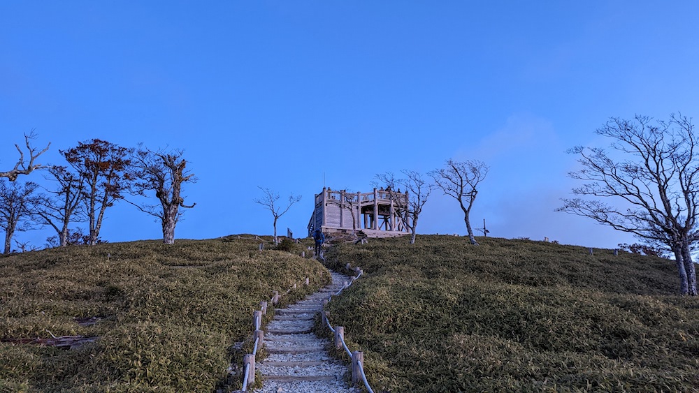 山林を抜けると見晴らしが良くなり、頂上への道のりが開けます。展望台もありますね。