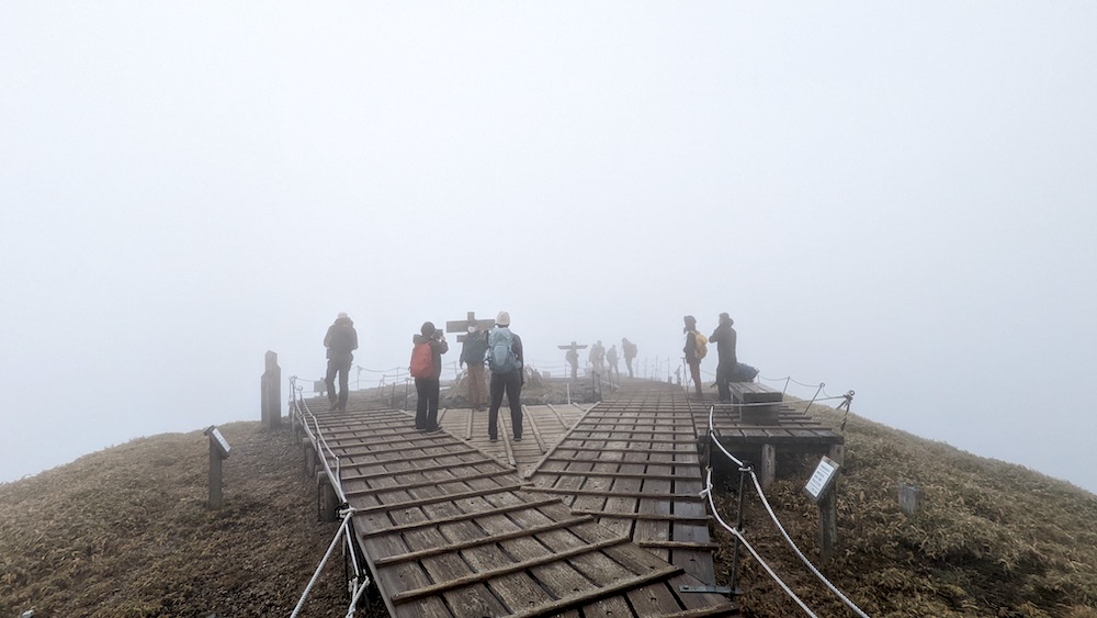 登山口の気温5度。頂上は2度で、ガスガス防風のためすぐに小屋に逃げてうどんを食べました。おでんもある!