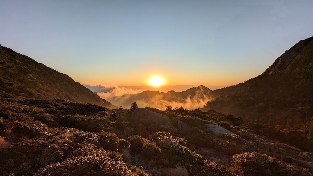 だんだん明るくなってきた。あとどれぐらいで日の出になるのだろうと時計を何回も見直す。日の出とともにオレンジ色の朝日が森に差し込む。山を照らす。温度の変化をわずかにかんじながら、雲ひとつない空を見上げる。