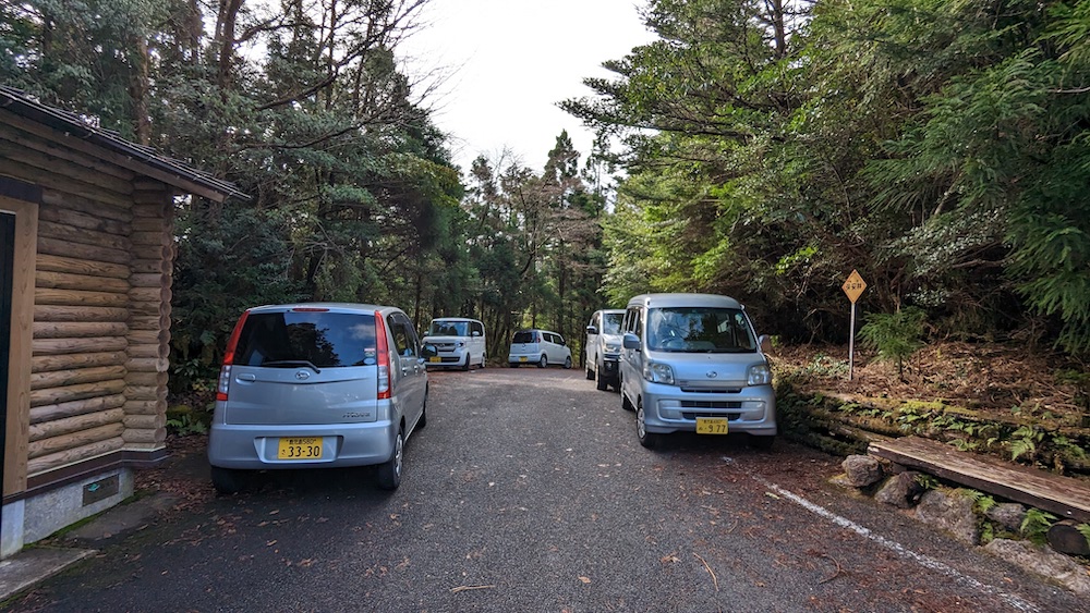 登山口の駐車スペースはわずか4台。奥側に4〜5台停めるスペースがあり、駐車場近くの側道にも何台か停めるスペースはある。オフシーズンの12月だが(地元の人が言うのはもうすぐ雪になる時期らしい)、車はかなり停まっていた。