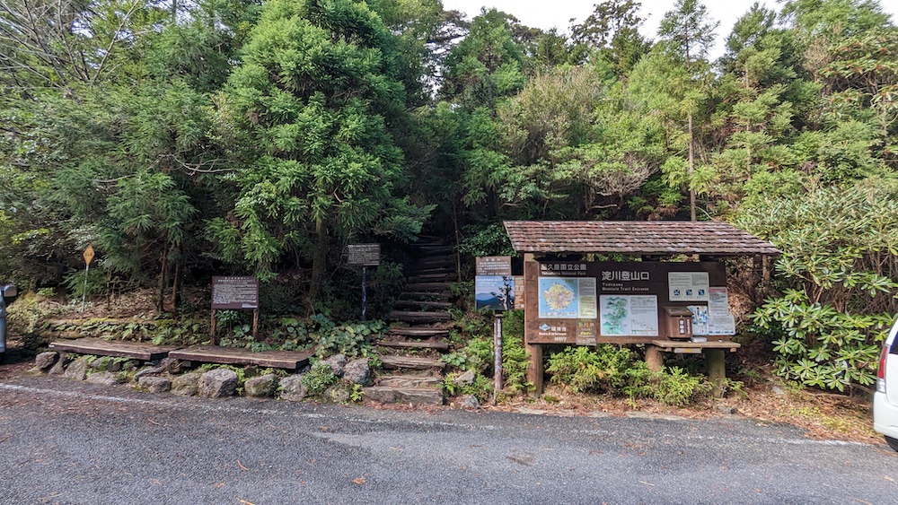 ホテルから登山口となる淀川登山口までは1時間少し。道は2車線が続き、山道もバスが通れる適度な広さがあるので快適。ただ、狭いので動物と車とのすれ違いには注意しなければならない。