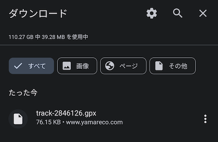 するとスマホにGPXファイルがダウンロードされます。
