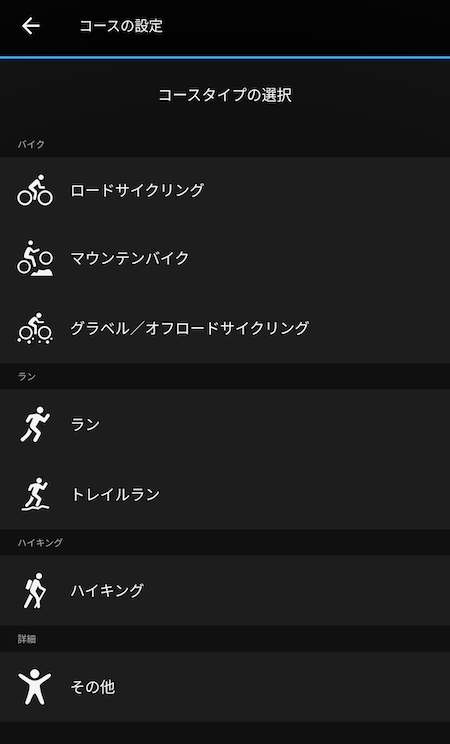 コースタイプの選択画面が表示されるので、ハイキングを選んでおきます。