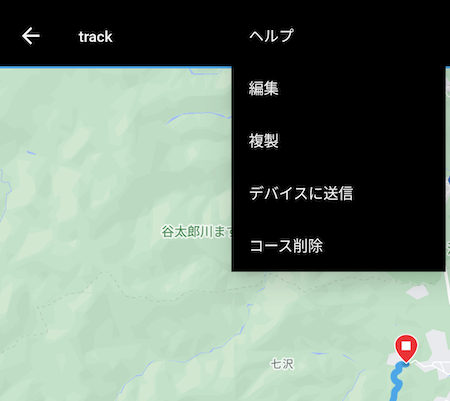 すると、アクションメニューが表示されるので、「GPXファイルをダウンロード」をタップします。GPXファイルはGPSのデータで構成されたコース情報です。