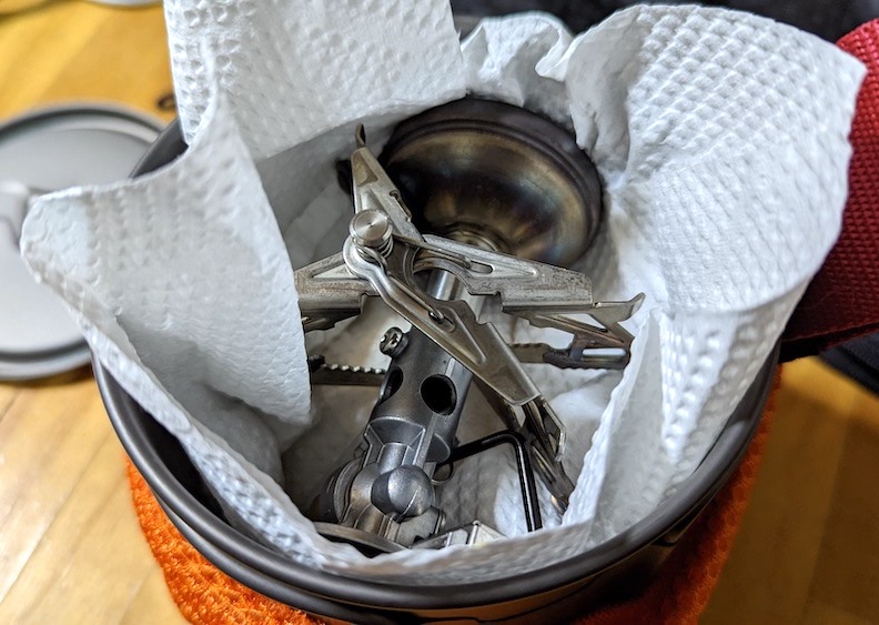 ふと気がついたのですが、薄いチタンなので、飲み口に力を入れると円形が楕円形に曲がります。その状態だとバナーが入るので、傷がつかないようにキッチンシートを挟んで収納に成功。