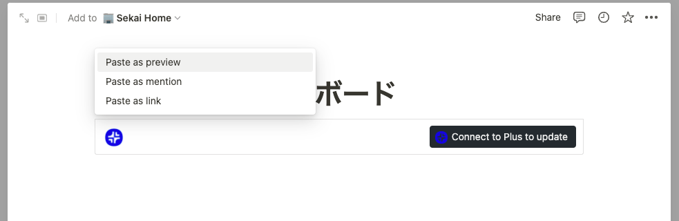 Notionに貼り付けるとPlusへの接続ボタンが出るので接続。