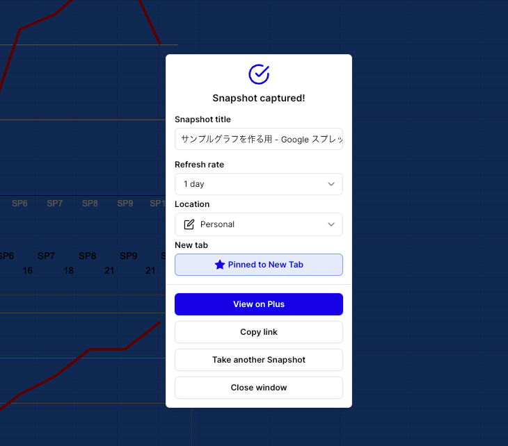 使い方もめっちゃ簡単です。Chrome拡張をインストールする > 取得したいグラフをブラウザで表示してキャプチャする > キャプチャしたデータを使う・・・以上!
