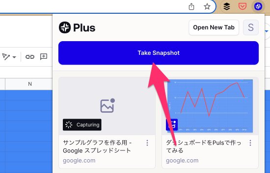キャプチャしたいグラフとして、ここではサンプルのベロシティチャートを描いたスプレッドシートを開きます。Chrome拡張から「Take snapshot」を選んで・・・