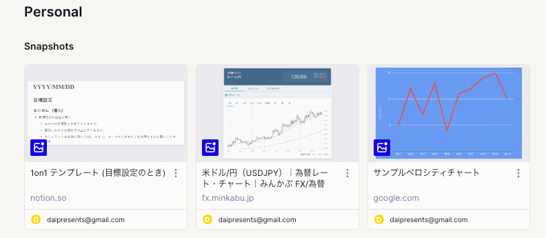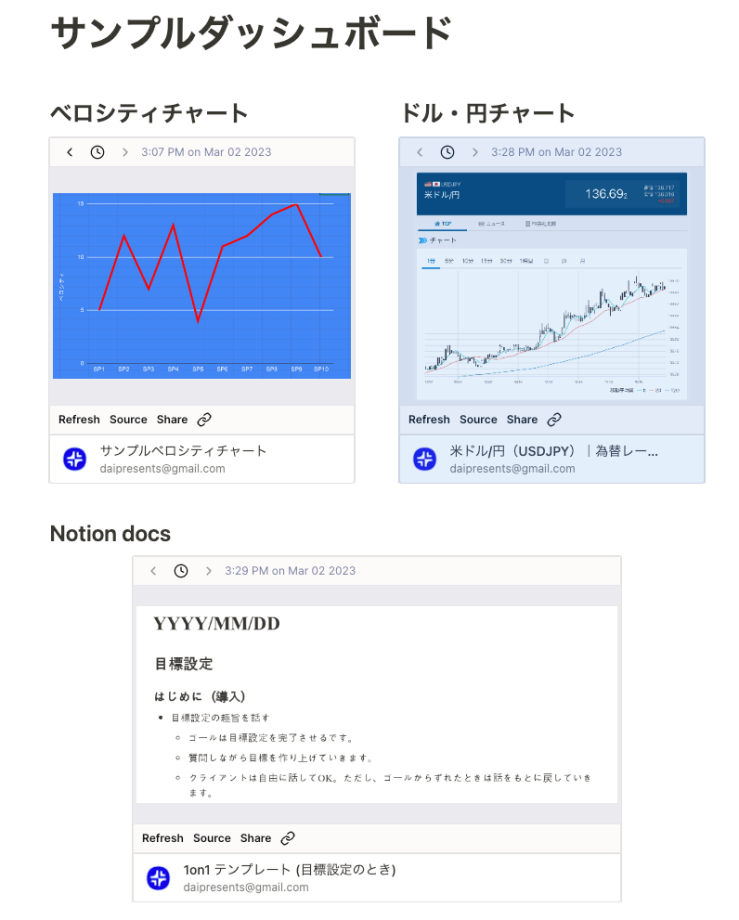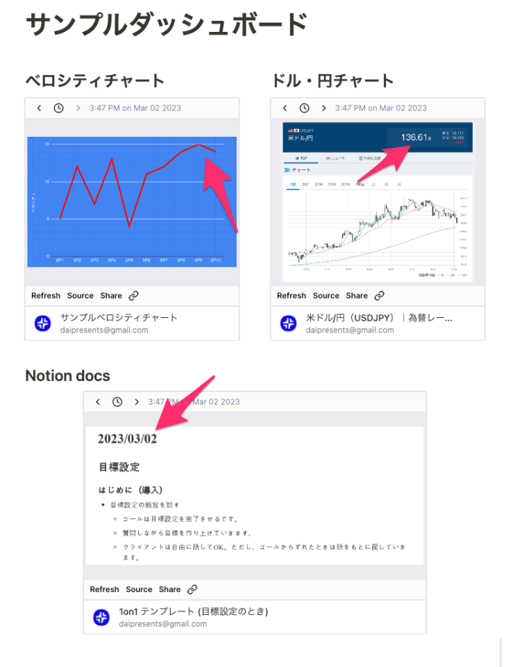 データが変わったときの反応を見たいので、スプレッドシートのグラフ、Web上のドル/円チャート、NotionのDocsの3つをキャプチャしてみました。