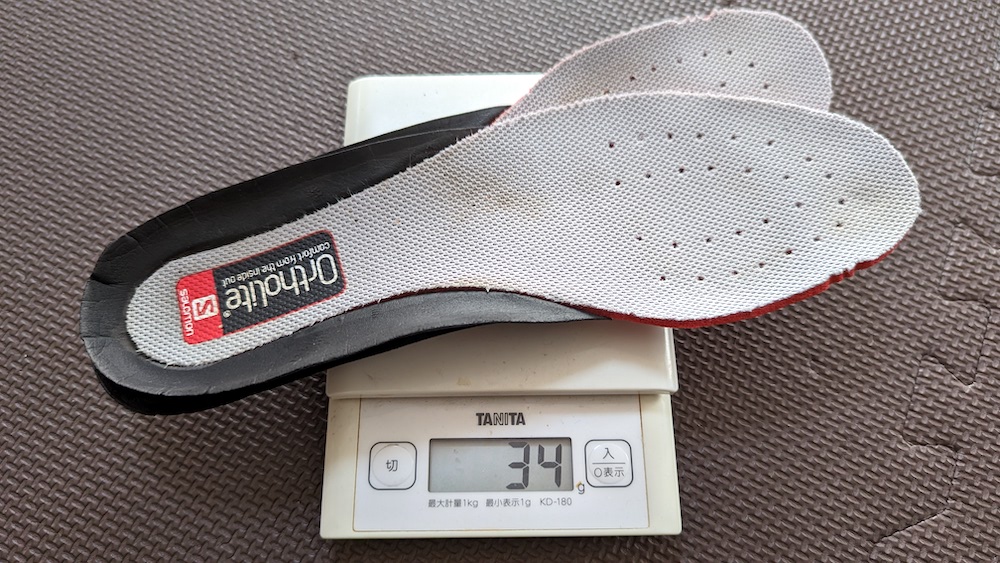靴にデフォルトで付いているインソールと比べると、ザムストのものは倍以上の重さです。せっかく靴をサロモンのULTRA4に軽量化したけど、65g重くなりますね。