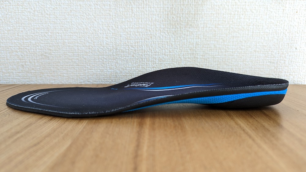 横から見るとこんな感じで、形状は似ています。ただ、踏みつけるとサロモンのインソールはぺたんこになり、ザムストのインソールは、つちふまずにぴったりはまるかんじです。