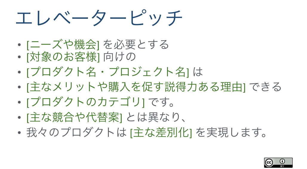 「われわれはなぜここにいるのか?」は「なぜ、Why」のためのスライドでした。エレベーターピッチは「プロダクトそのもの、何を、What」を明確にするものです。自分たちのやっている「こと」や自分たちの顧客、プロダクトの特性が明らかになります。