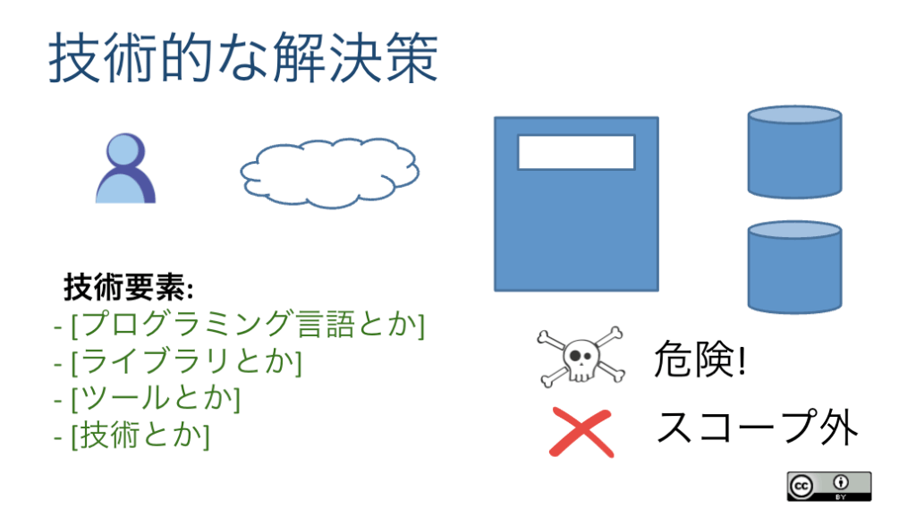 この方法によって、解決策から技術的な課題を洗い出せます。解決策としたライブラリや言語、アーキテクチャが適切かどうか? チーム内で合意が取れているか? リスクがどれぐらいあるか?を話し合えます。もし、アイデアがない場合は、正直に白状しましょう。あとで話すよりも、今話しておいたほうがいい方向に進みます。