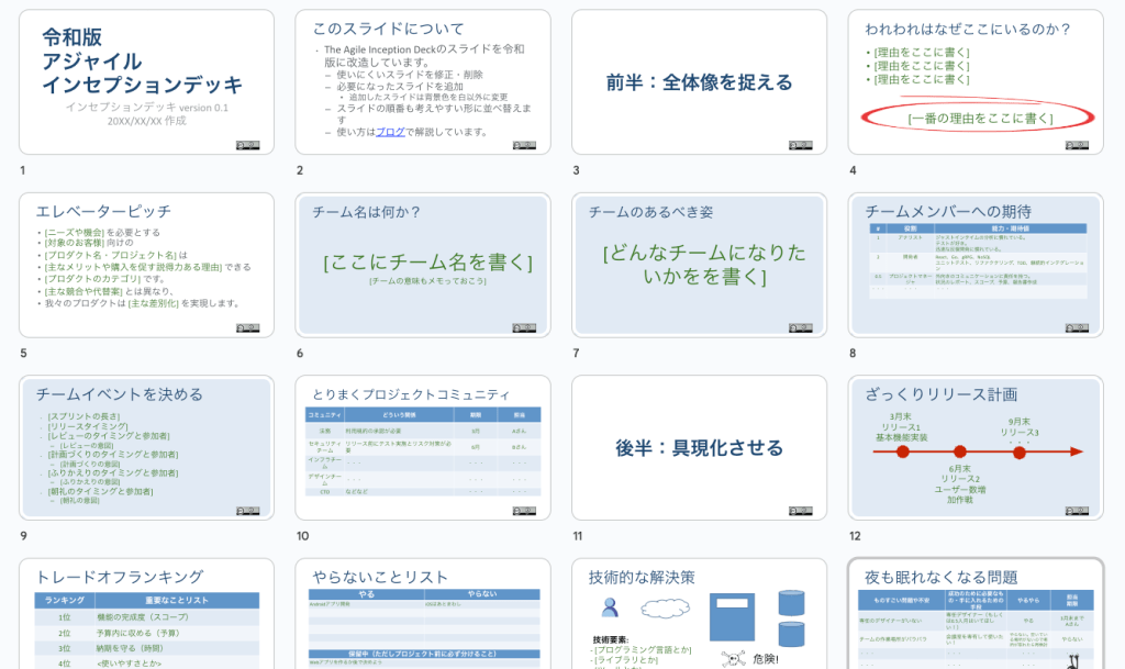 昨日、インセプションデッキの解説を翻訳したのですが、令和にもなったので今風なインセプションデッキのテンプレートを作ってみました。