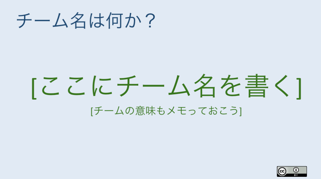 インセプションデッキの表紙として追加したスライドです。自分たちに名前をつけましょう。表紙には大きく、クールな響きを持つチーム名を記載します。自分の子供に名前をつけるのと同じ気持ちでやれば、チームに親近感がわくはずです。