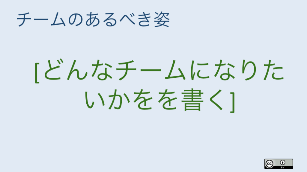 どういったチームになりたいか? どういったチームで働きたいか? メンバーはどうふるまるべきか? 多種多様な時代であれど、チームで働くためには規律が必要です。アジャイル開発で実現したい自分たちの姿を書いてみるといいと思います。