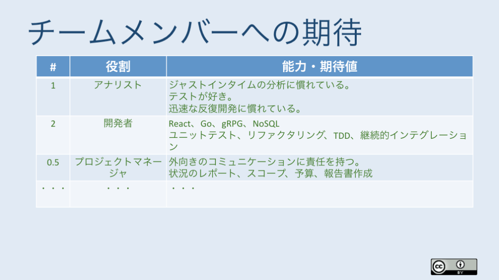 このプロジェクトを成功させるために、誰が必要で、どのようなスキルが必要なのかをまとめます。特定の人物が重要な場合は、バイネームで書き込みます。