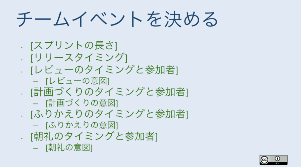 イベントと同時に、そのイベントの意図も明示しましょう。アジャイルチーム以外の人にとっては、「スプリントレビュー? なにそれ?」です。どういった意味を持たせ運用したのかを説明するチャンスです。