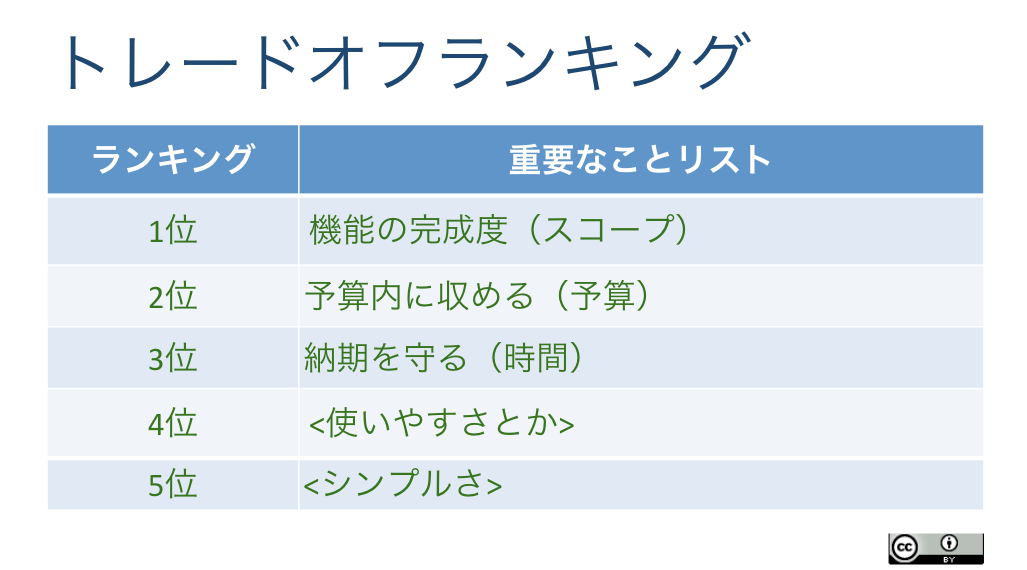 スライダーはわかりにくいのでランキング形式にしました。また、品質は最近トレードオフ対象じゃなくなってきたようなので削除しました。アジャイルチームは人件費と追加型で予算を考えるケースが多いので、予算もなくてもいいかもしれません。予算というより売上とかのほうがいいのかも?