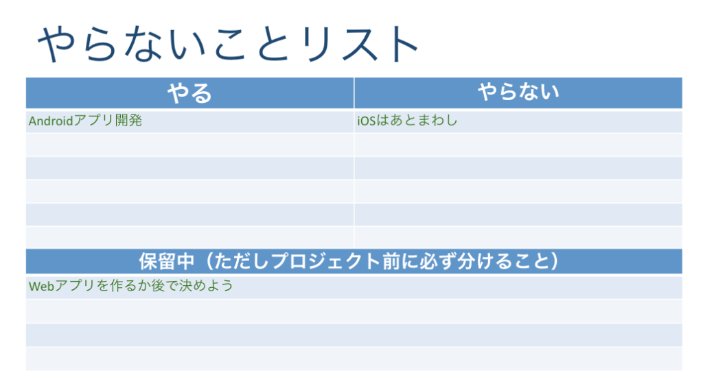 やること、やらないことをリストアップします。保留中のものはプロジェクト前にかならず「やる」、「やらない」を決めましょう(『アジャイルサムライ』だと「いつか決める」になってますが、「いつまでも決まらない」になりがちなのですぐ決めちゃいましょう)。