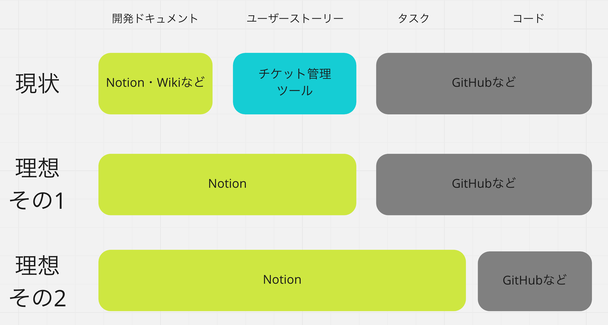 - 理想その2: 開発ドキュメント、ユーザーストーリー、タスクまでをNotion、コードのみGitHubとするパターン