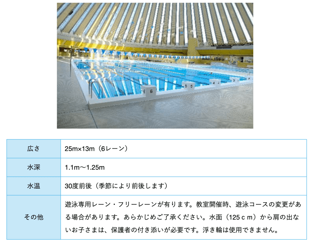 教室でほとんどのコースが使われるため、泳げるコースが少ないです。また子供用プールがなく、25m泳ぐ力が求められるので、子供向けプールではなさそうです。よって、行く予定はありません。