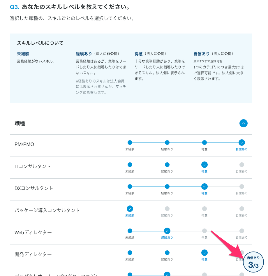 実際のスキル入力は、スライダー形式です。しかも自信があるものは3つだけ選択できます。
