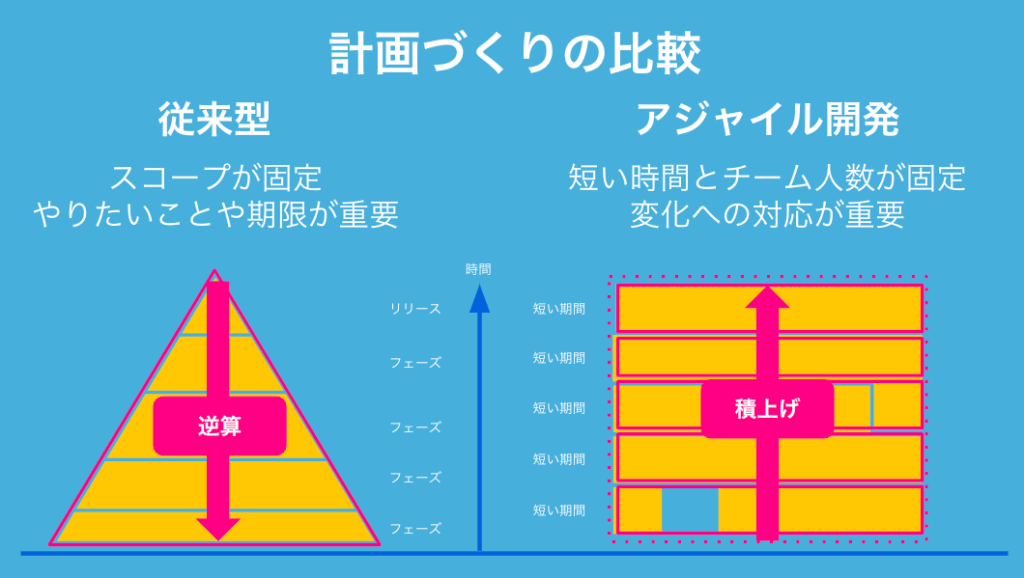 それぞれの方法は、大切なものが違います。締め切り駆動だと締切で、やれること駆動だと変化への対応が重要です。アジャイル開発は変化への対応を大切にするので、後者を選択するケースが多いです。