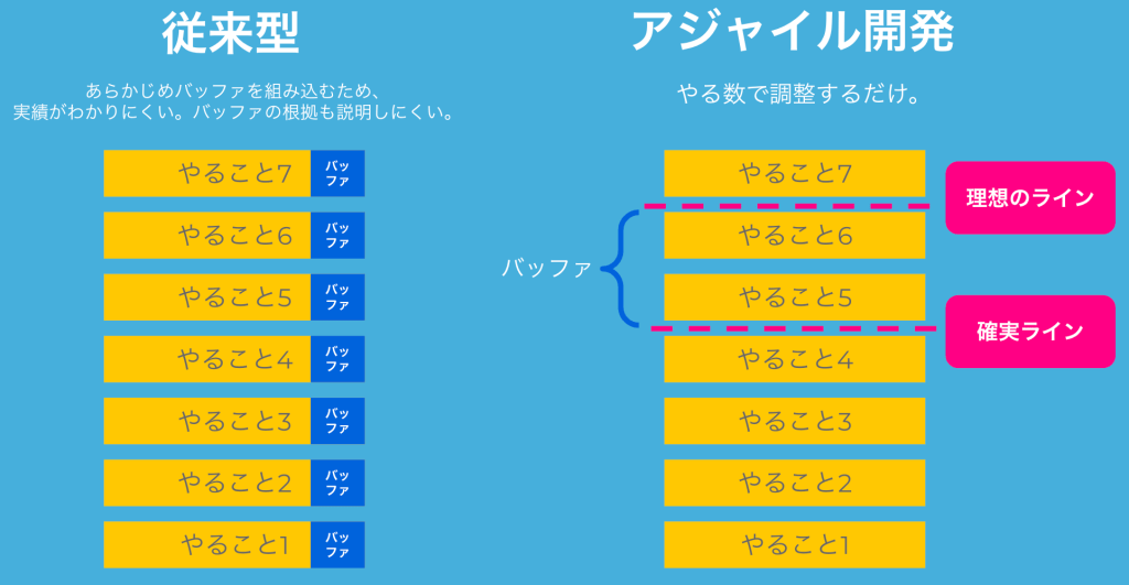 「いやいやそれがアジャイルだから」みたいなこと言う人も言いますが、約束を守らないのがアジャイル開発だというのであれば、それは間違いです。